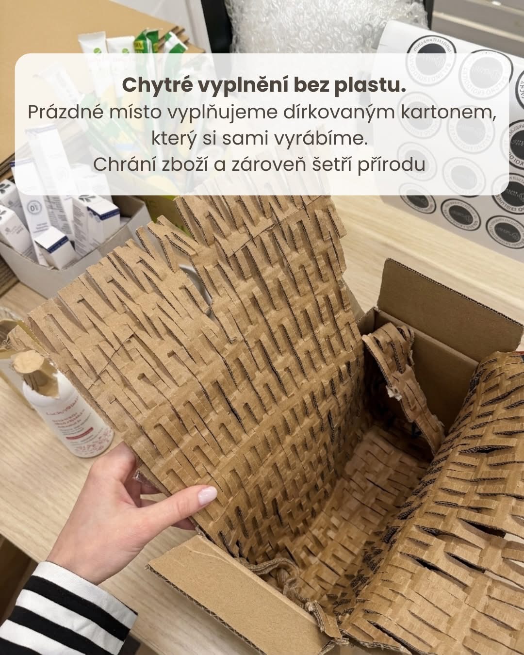 Máme systém na výrobu vlastní výplně z lisovaného použitého kartonu. Staré krabice přetvoříme na pružnou papírovou "střiž", která dokonale ochrání i ty nejkřehčí produkty. Stejně tak využíváme výplně (jako jsou papírové polštářky nebo kartony), které k nám dorazily od dodavatelů. U nás prostě nic nekončí v koši.