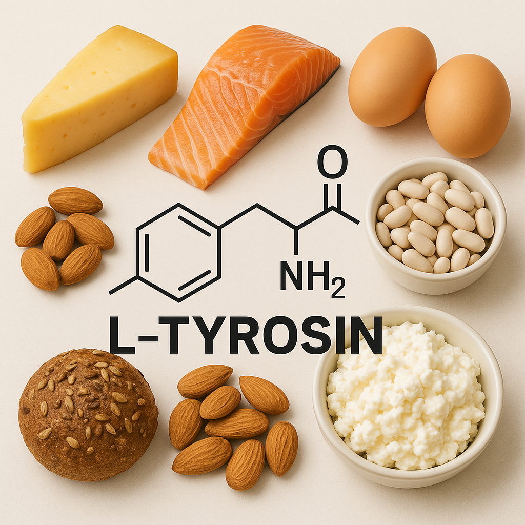 L-tyrosin je neesenciální aminokyselina, což znamená, že si ji naše tělo dokáže samo vyrobit - konkrétně z jiné aminokyseliny jménem fenylalanin. Název „tyrosin“ pochází z řeckého slova tyros = sýr, protože byl poprvé izolován v roce 1846 z kaseinu (mléčné bílkoviny). Takže ano - když jíte sýr, pravděpodobně přijímáte i nějaký tyrosin.
