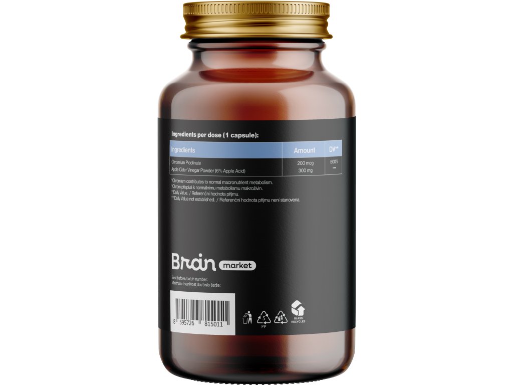 Složení: Chrom pikolinát (200 mcg, RHP 500 %), prášek z jablečného octa (6 % jablečné kyseliny) (300 mg, RHP ***). Rostlinná kapsle na bázi HPMC. Bez obsahu balastních látek.