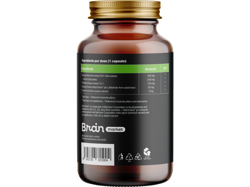 Složení na 1 kapsli: Extrakt z bakopy drobnolisté (Bacopa Monnieri, 50 % bakosidů) (400 mg, RHP **), z toho bakosidy (200 mg, RHP **), extrakt z Rozchodnice růžové 10:1 (Rhodiola Rosea) (100 mg, RHP **), přírodní cholin VitaCholine® (jako L-bitartrát z kvasnic) (50 mg, RHP **), extrakt z černého pepře (Piperin 95 %) (3 mg, RHP **).