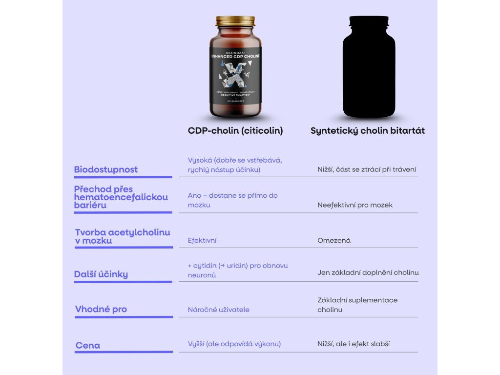 CDP cholin patří k nejlépe vstřebatelným formám a na rozdíl od běžně dostupné formy cholinu (syntetickému cholinu bitartrátu) velice dobře prochází přes hematoencefalickou bariéru. To nejlepší pro ty nejnáročnější uživatele.