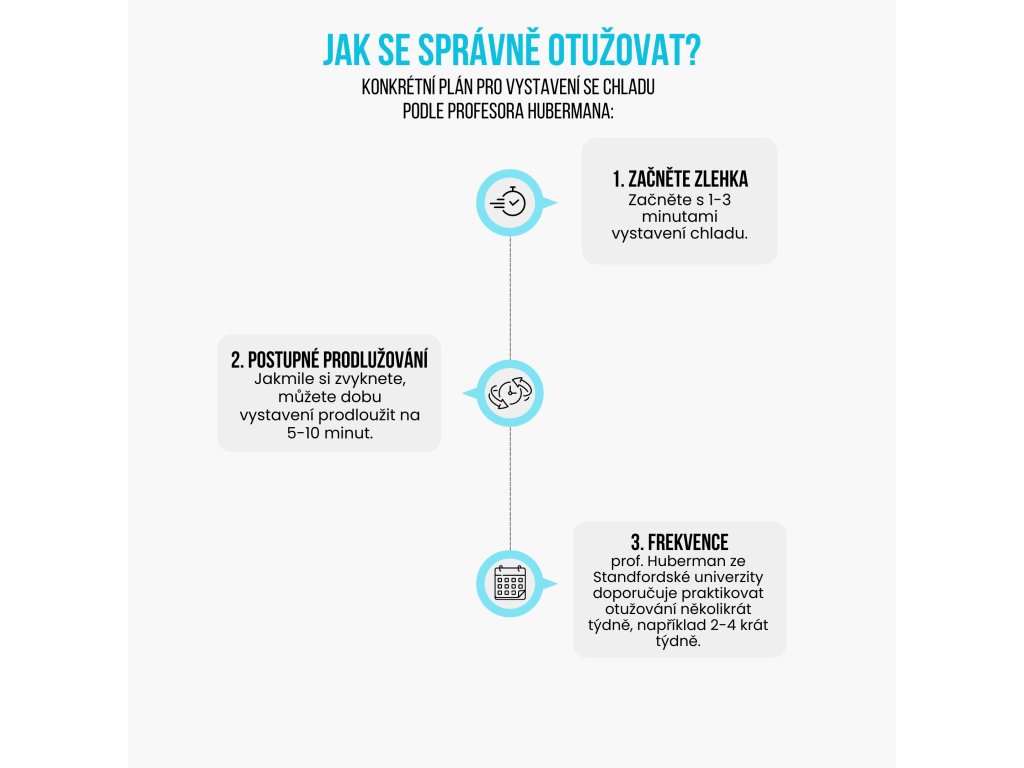 - 3. Frekvence: prof. Huberman ze Standfordské univerzity doporučuje praktikovat otužování několikrát týdně, například 2-4 krát týdně.