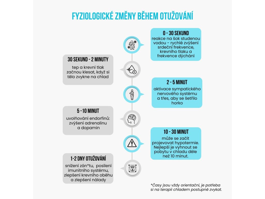 - Zlepšení cirkulace krve - chlad pomáhá stimulovat průtok krve, což může zlepšit cirkulaci a pomoci svalům rychleji se regenerovat po fyzické námaze.