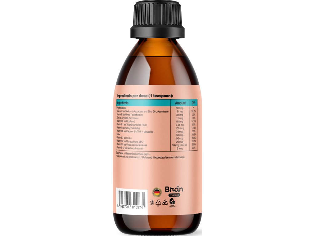 Složení: Voda, glycerol (přírodní stabilizátor), mango aroma, fosfolipidy (slunečnicový lecithin) (500 mg, RHP **), Vitamin C (jako Sodium L-Ascorbate a Zinc Di-L-Ascorbate) (21 mg, RHP 26,2 %), Vitamin E (jako Mixed Tocopherols) (3,6 mg, RHP 30 %), Zinek (jako Zinc Di-L-Ascorbate) (1,5 mg, RHP 15 %), kyselina citronová monohydrát, Vitamin B2 (jako Riboflavin) (0,8 mg, RHP 57,1 %), Vitamin B1 (jako Thiaminechloride HCL) (0,55 mg, RHP 50 %), Vitamin A (jako Retinyl Palmitate) (100 mcg, RHP 12,5 %), Vitamin B9 (jako Calcium 5-MTHF / Metafolin) (70 µg, RHP 35 %), Jód (jako Potassium Iodide) (50 µg, RHP 33,3 %), Vitamin B7 (jako Biotin) (50 µg, RHP 100 %), Vitamin K2 (jako Menaquinone MK7) (20 µg, RHP 26,7 %), Vitamin D3 (jako Vegan Cholecalciferol) (10 µg, RHP 200 %), extrakt z rozmarýnu (kyselina karnozová +), Vitamin B12 (jako Methylcobalamin) (2 µg, RHP 80 %).