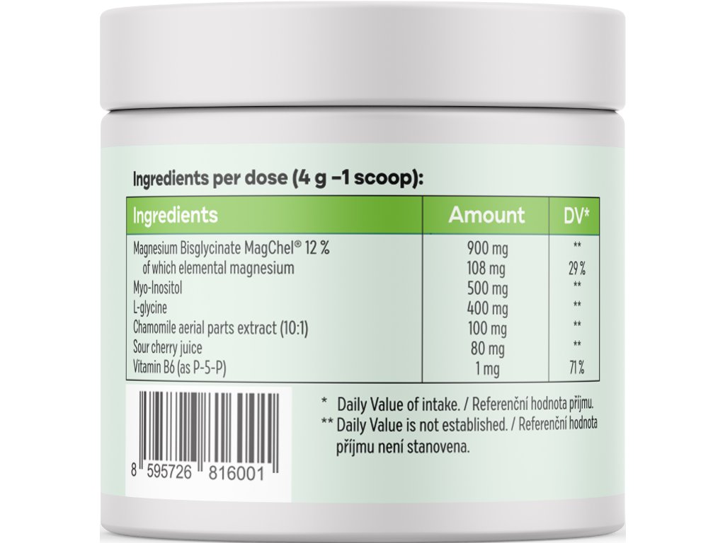 Složení: Bisglycinát hořečnatý MagChel® (900 mg, RHP **), z toho elementární hořčík (108 mg, RHP 29 %), stabilizátor: kyselina citronová, myo-inositol (500 mg, RHP **), L-glycin (400 mg, RHP **), lyofilizovaný broskvový prášek, přírodní aroma, agáve inulin, barvivo: extrakt ze světlice barvířské, heřmánek extrakt z natě (10:1) (100 mg, RHP **), extrakt z višně (80 mg, RHP **), vitamín B6 jako P-5-P (1 mg, RHP 71 %).