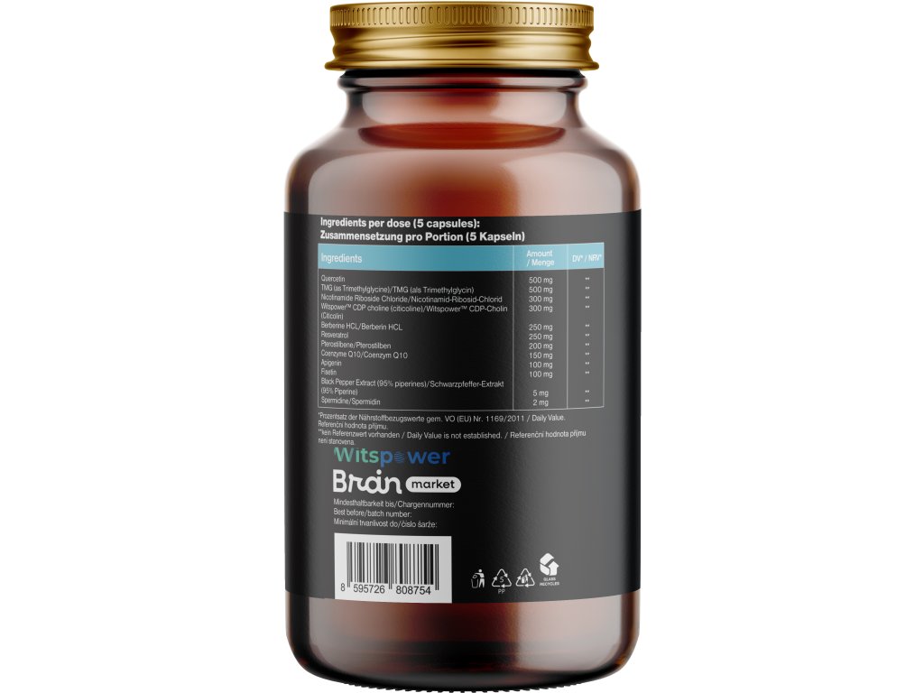 Složení: kvercetin (500 mg, RHP **), trimethylglycin (500 mg, RHP **), nikotinamid ribosid chlorid (300 mg, RHP **), CDP cholin (citikolin) jako Witspower™ (300 mg, RHP **), resveratrol (250 mg, RHP **), pterostilben (200 mg, RHP **), koenzym Q10 (150 mg, RHP **), apigenin (100 mg, RHP **), fisetin (100 mg, RHP **), extrakt z černého pepře (95% piperinů) (5 mg, RHP **), spermidin (2 mg, RHP **). Rostlinná kapsle na bázi HPMC. Neobsahuje žádné balastní látky (éčka).