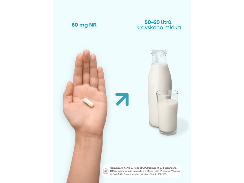 NR hraje klíčovou roli v energetickém metabolismu1. Kombinace s TMG a pterostilbenem (polyfenolem s vysokou biologickou dostupností) je cílená na optimalizaci metabolismu NAD+ a aktivaci sirtuinů. Dávka 300 mg odpovídá přibližně 100 mg niacinu. Oproti niacinu ale nezpůsobuje zarudnutí pokožky a je tak vhodný pro dlouhodobé užívání v rámci longevity protokolů.