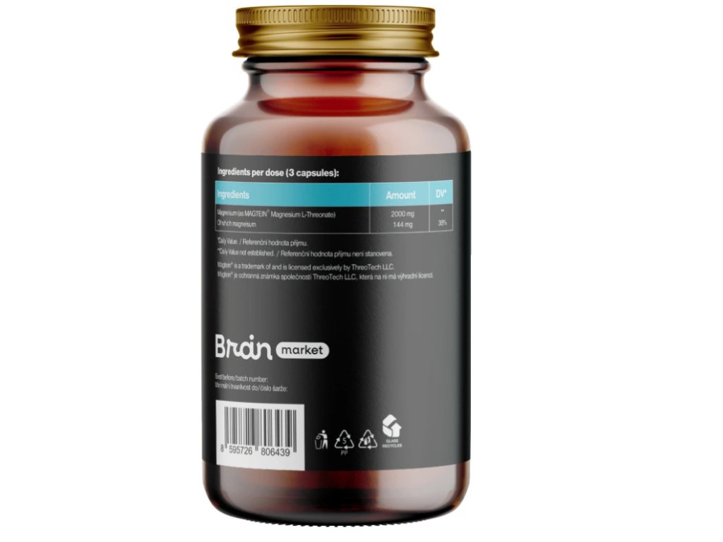 Složení: Patentová forma hořčíku: Magtein® (Magnesium L-Threonate). Rostlinná kapsle na bázi HPMC. Neobsahuje žádné balastní látky (éčka).