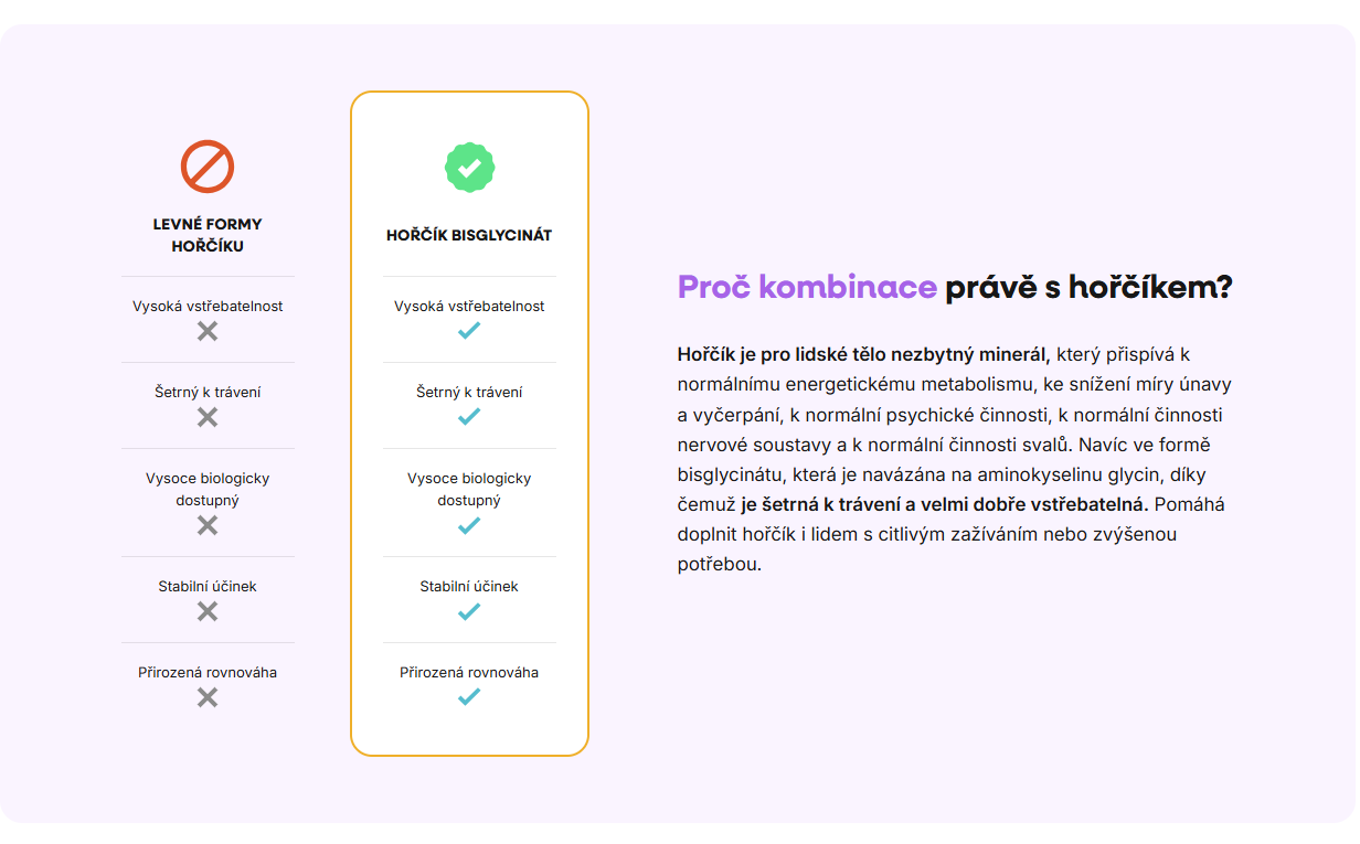 Hořčík je pro lidské tělo nezbytný minerál, který přispívá k normálnímu energetickému metabolismu, ke snížení míry únavy a vyčerpání, k normální psychické činnosti, k normální činnosti nervové soustavy a k normální činnosti svalů. Navíc ve formě bisglycinátu, která je navázána na aminokyselinu glycin, díky čemuž je šetrná k trávení a velmi dobře vstřebatelná. Pomáhá doplnit hořčík i lidem s citlivým zažíváním nebo zvýšenou potřebou.