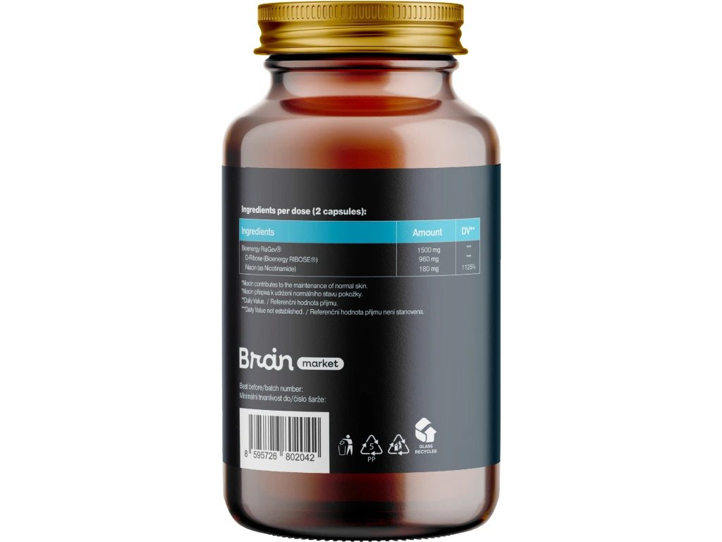 Složení: Bioenergy RiaGev® (1500 mg, RHP **) složený z D-Ribose (Bioenergy RIBOSE®, 960 mg, RHP **) a Niacin (jako nikotinamid, 180 mg, RHP 1125%), stabilizátor: palmový olej. Rostlinná kapsle na bázi HPMC. Upozornění: Ukládat mimo dosah dětí! Výrobek není určen pro děti, těhotné a kojící ženy. Nepřekračujte doporučené denní dávkování. Přípravek není určen jako náhrada pestré stravy. Dodržujte zdravý životní styl. Minimální trvanlivost/číslo šarže: viz. dno láhve.