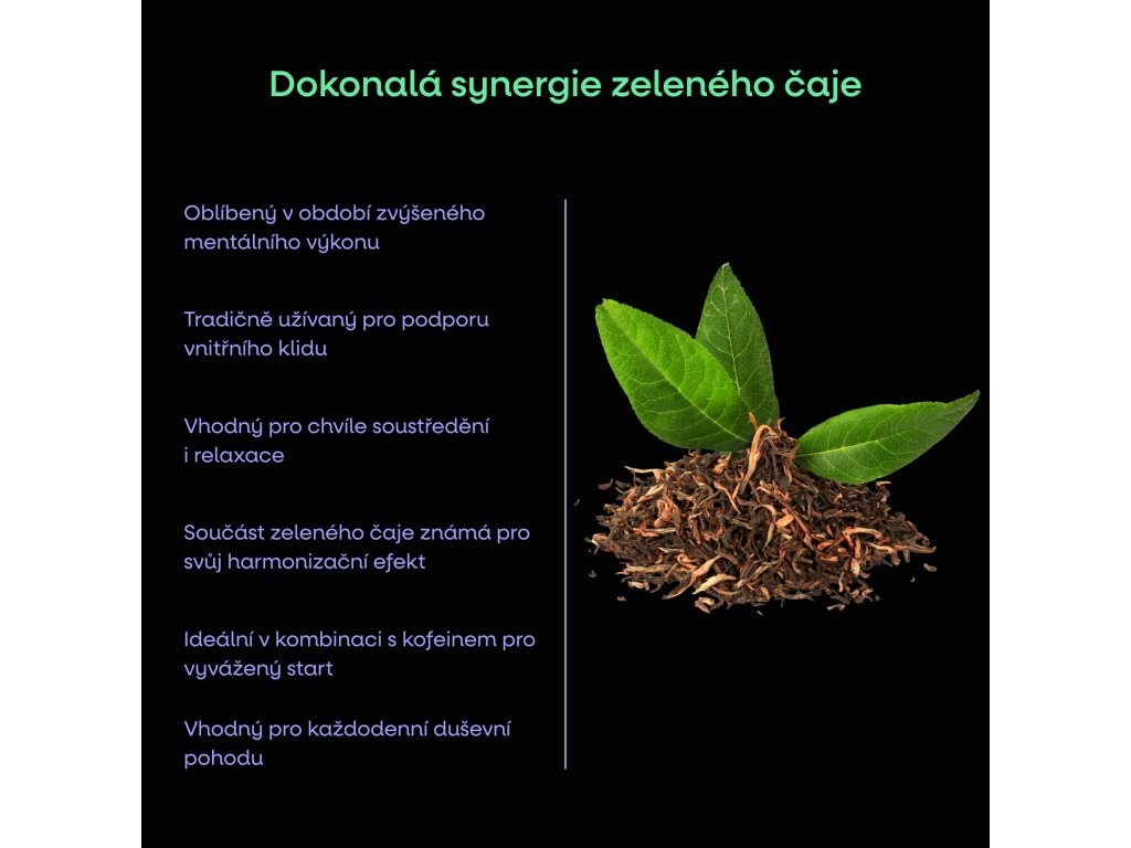 - L-theanin je aminokyselina přirozeně se vyskytující v listech zeleného čaje, které jsou tradičně spojovány s antioxidačními schopnostmi, duševní bdělostí, kognitivním výkonem a schopností koncentrace.1
