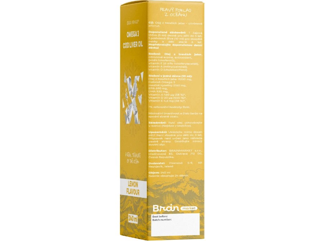 Proto jsme na trh přišli s vlastním olejem, kde v jedné polévkové lžíci najdete obsah mastných kyselin DHA a EPA rovnající se 3 až 8 želatinovým kapslím za nesrovnatelně nižší cenu, ale ve vysoké kvalitě. BrainMax olej z tresčích jater je totiž chráněn před oxidací vitamínem A i E, což umožňuje mnohem lepší využitelnost pro naše buňky. Zoxidovaný rybí olej poznáte tím, že buď smrdí rybinou anebo navozuje trávicí obtíže. Jako důkaz kvality můžete vyzkoušet jednoduchý test, kdy si dáte nalačno 2 polévkové lžíce našeho oleje a nepříjemné rybiny nebo trávicích potíží se nemusíte obávat. Olej v takové kvalitě je pro organismus přínosem a můžete s nim bezpečně doplňovat DHA i EPA přímo do buněk.
