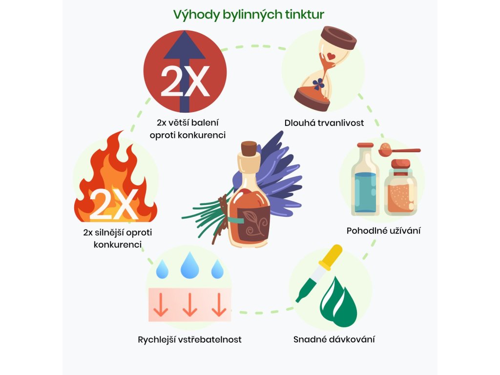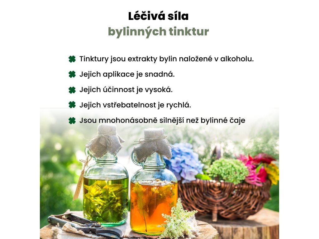 Macerování bylin je patrně nejstarší druh zpracování bylin. Rostliny máčené v destilovaném alkoholu napevno zakořenily i v západní medicíně. Alkohol se používá k "rozbití" buněčné stěny rostliny, což umožňuje uvolňování biologicky aktivních sloučenin. Do tinktury jsou vybírány rostliny nejvyšší kvality a po důkladném očištění jsou pozvolna louhovány v 25% alkoholu. Tinktury jsou mnohem koncentrovanější než samotné odvary z bylin a díky tomu jsou jejich účinky patrnější během kratší doby. Navíc díky obsahu alkoholu mají dlouhou trvanlivost a při správném skladování vydrží i několik let. Tinktura je balena v tmavých lahvičkách, aby byla dostatečně chráněna před působením světla. Můžete užívat samostatně, ale také přidat do vody nebo džusu.