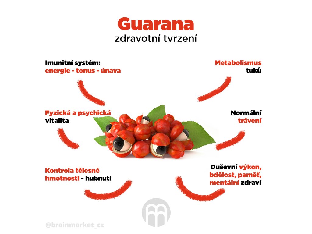 Díky alkaloidům obsaženým v guaraně nedochází k rychlému vyhoření energie jako u kávy. Guarana má mnoho pozitivních účinku na organismus. Mezi schválená zdravotní tvrzení patří: Imunitní systém: energie - tonus - únava, fyzická a psychická vitalita, kontrola tělesné hmotnosti, metabolismus tuků, normální trávení, tonizace těla a mysli, duševní výkon, bdělost, paměť, mentální zdraví.