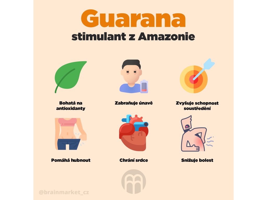 Pokud potřebujete energii a běžná káva už na vás nezabírá, pak by pro vás guarana mohla být řešením, neboť přivádí okamžitou energii pro tělo i mysl a zároveň zvyšuje koncentraci. Díky vyššímu obsahu alkaloidů, pak nedochází podobně jako u kávy k brzkému energetickému vyhoření.