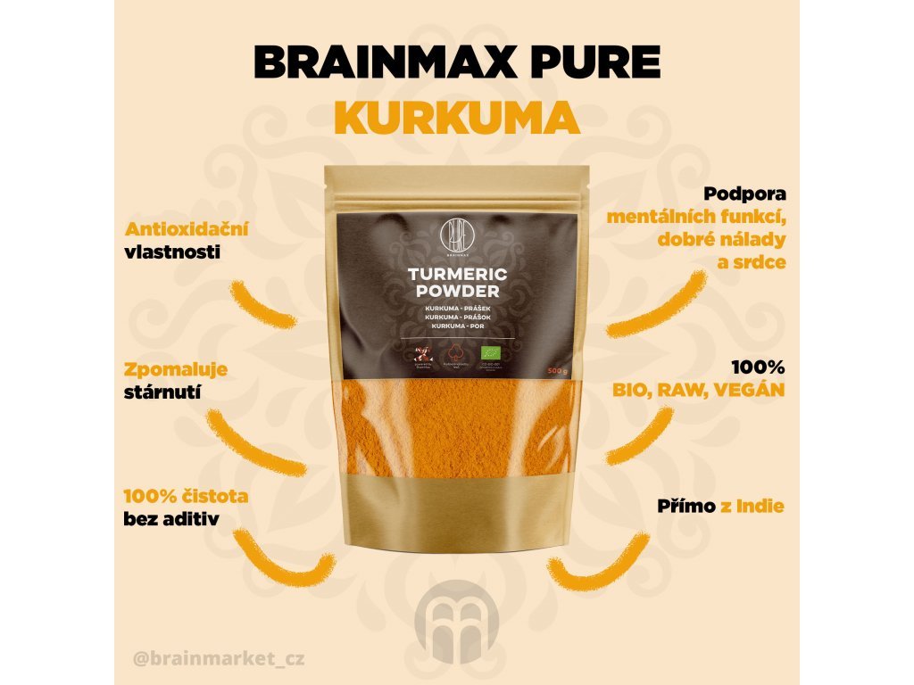 BIO Kurkuma s obsahem přírodního kurkuminu. 100% čistá kurkuma v prášku z kontrolovaného ekologického zemědělství. Kurkuma je tradičně používané koření s přirozeným obsahem kurkuminu – přírodního rostlinného polyfenolu. BrainMax Pure Kurkuma v BIO kvalitě bez přidaných látek, ideální pro každodenní použití do nápojů a pokrmů.