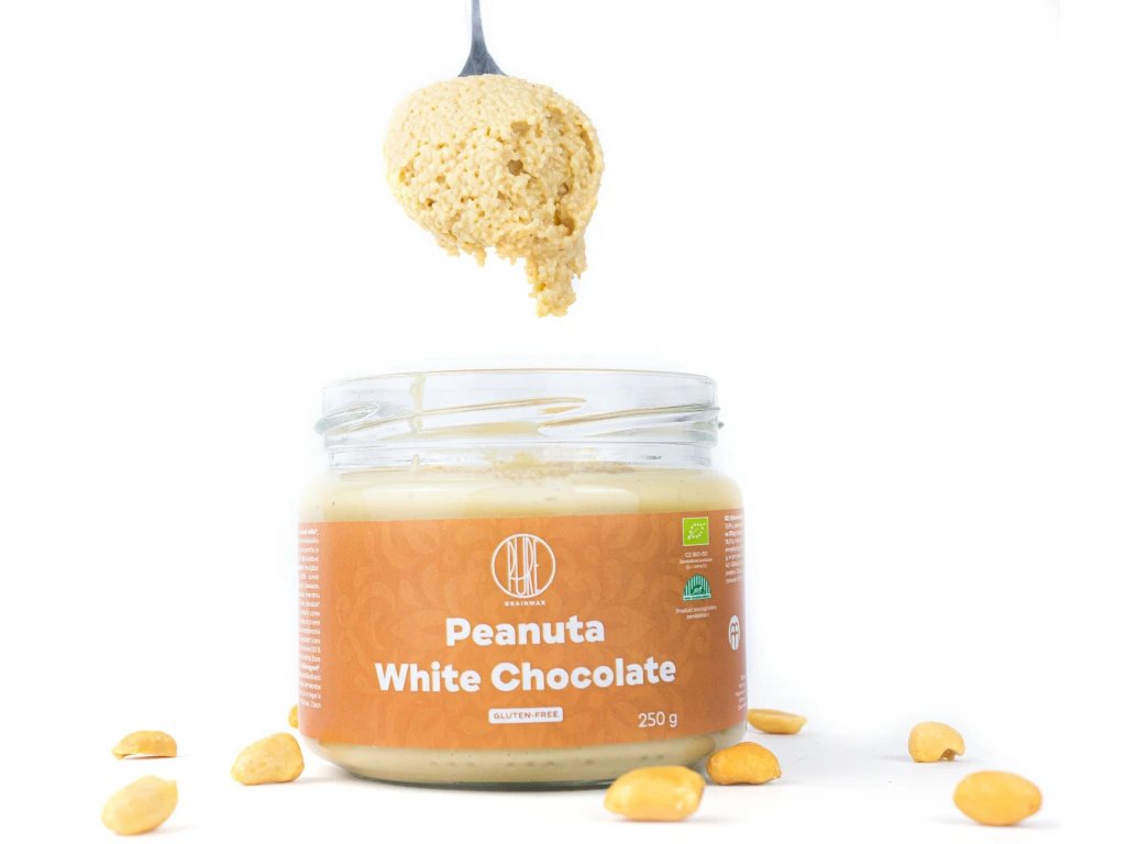 Vsadili jsme na kombinaci arašídů a bílé čokolády! A proto představujeme BrainMax Pure Peanuta White Chocolate, který tvoří pouze rozemleté organické arašídy a BIO bílá čokoláda. Arašídový krém, který jsme doladili značnou porcí kvalitní bílé čokolády. Krém má vynikající chuť a také důležité makroživiny.