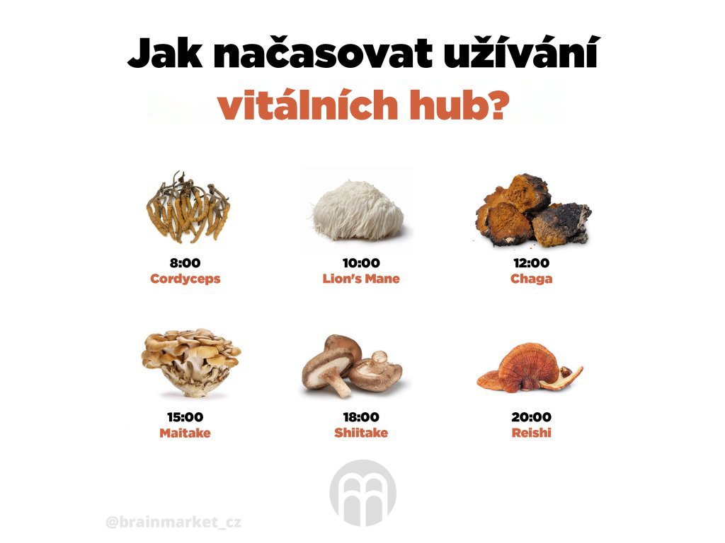 - Při užívání vitálních hub doporučujeme zvýšit příjem vitamínu C, který zvyšuje vstřebatelnost účinných látek.