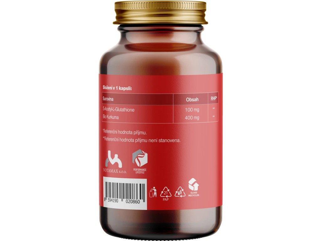 Složení: S-Acetyl-L-Glutathion, BIO kurkuma. Neobsahuje žádná plnidla ani stabilizátory, pouze deklarované složení v nejčistší formě. Rostlinné kapsle na bázi hydroxypropylcelulózy.