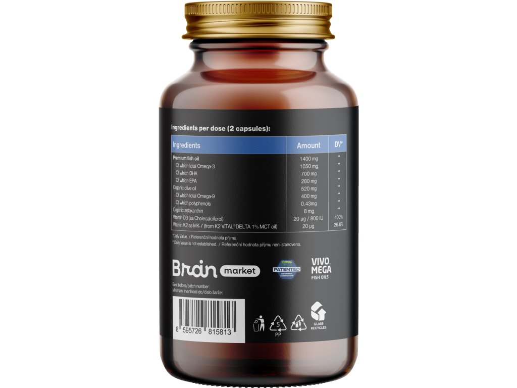 Rybí olej v tomto produktu pochází z prvotřídního zdroje VivoMega®. Díky pokročilému procesu molekulární destilace splňuje nejpřísnější standardy kvality. Olej má ideální poměr omega 3 mastných kyselin DHA 2,5:1 EPA pro normální činnost mozku¹. Je zpracován do přírodní triglyceridové formy, která zajišťuje až o 70 % lepší vstřebatelnost oproti běžným ethylesterům. Díky extrémně nízkému oxidačnímu indexu (TOTOX = 5) je zaručena vynikající čerstvost a stabilita oleje bez nepříjemné pachuti.