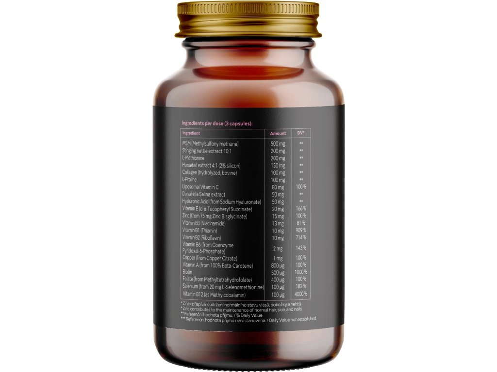 Složení (3 kapsle): MSM (jako methylsulfonylmethan) (500 mg, NRV **), kopřiva dvoudomá (extrakt 10:1) (200 mg, NRV **), L-Methionin (200 mg, NRV **), přeslička rolní (extrakt 4:1, 2 % křemíku) (150 mg, NRV **), kolagen (hydrolyzovaný, bovinní) (100 mg, NRV **), L-Prolin (100 mg, NRV **), lipozomální vitamin C (80 mg, NRV * 100 %), dunaliella salina extrakt (50 mg, NRV **), kyselina hyaluronová (jako hyaluronan sodný) (50 mg, NRV **), vitamin E (jako D-α-tokoferylsukcinát) (20 mg, NRV * 166 %), zinek (bisglycinát zinečnatý) (15 mg, NRV * 100 %), vitamin B3 (jako nikotinamid) (13 mg, NRV * 81 %), vitamin B1 (jako thiamin) (10 mg, NRV * 909 %), vitamin B2 (jako riboflavin) (10 mg, NRV * 714 %), vitamin B6 (jako pyridoxal-5-fosfát) (2 mg, NRV * 143 %), měď (jako citrát měďnatý) (1 mg, NRV * 100 %), vitamin A (jako beta-karoten) (800 µg, NRV * 100 %), biotin (jako biotin (500 µg, NRV * 1000 %), folát (jako methylfolát) (400 µg, NRV * 200 %), selen (jako L-selenomethionin) (100 µg, NRV * 182 %), vitamin B12 (jako methylkobalamin) (100 µg, NRV * 4000 %). Rostlinná kapsle na bázi HPMC. Bez obsahu balastních látek.