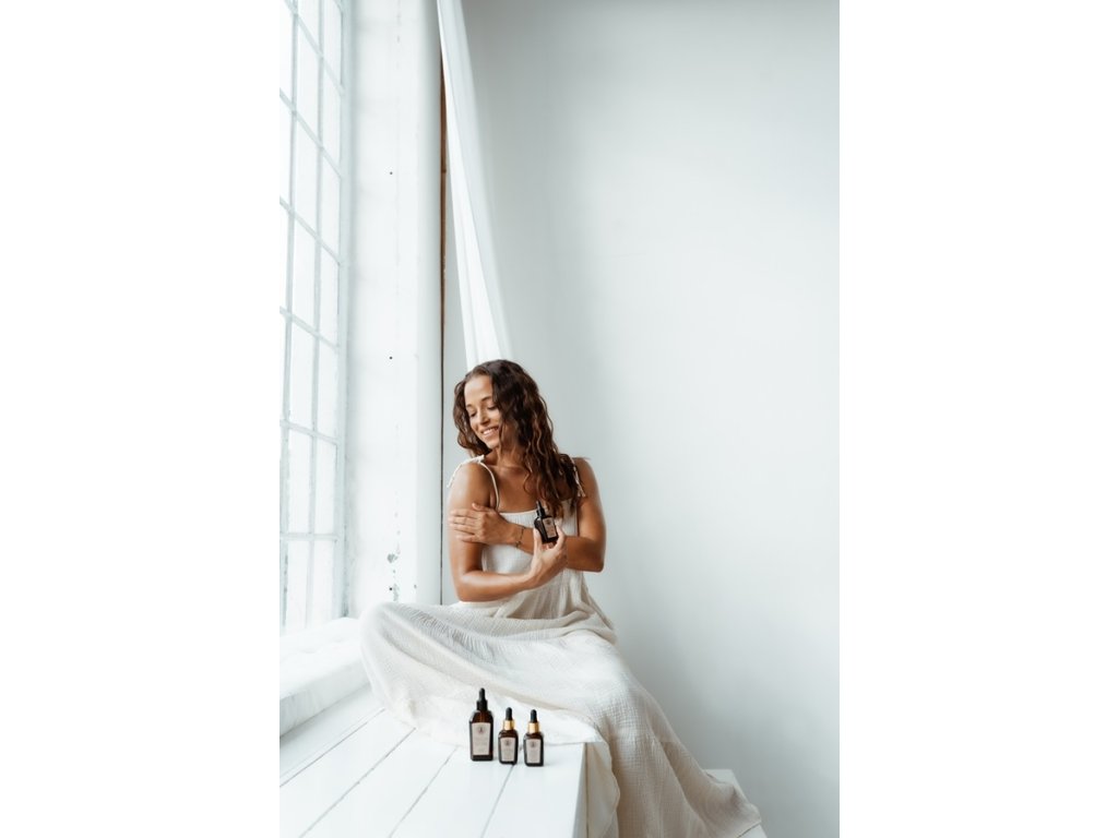 Tělové oleje doporučujeme používat ideálně po sprše či koupeli, jelikož vodou zvláčněná pokožka lépe oleje vstřebává. Nakapejte pár kapek oleje mezi prsty, promněte a jemnými krouživými pohyby vmasírujte to pokožky.