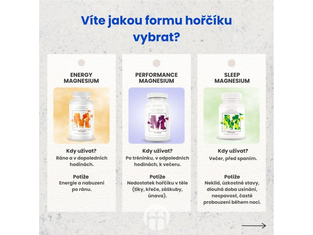 Pro správné doplnění hořčíku v průběhu dne je ideální začít ráno s Energy Magnesium®, které obsahuje hořčík malát přispívající k normálnímu energetickému metabolismu. Performance Magnesium®, které kombinuje hořčík bisglycinát a vitamín B6, doplňujte po fyzické aktivitě nebo odpoledne, aby přispělo k normální činnosti nervové i svalové soustavy a snížení únavy a vyčerpání. Sleep Magnesium® užívejte zhruba 30 minut před spaním. Tento doplněk obsahuje hořčík bisglycinát a další látky, které mají vliv na kvalitu spánku.